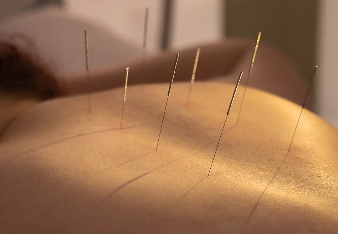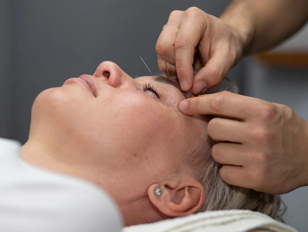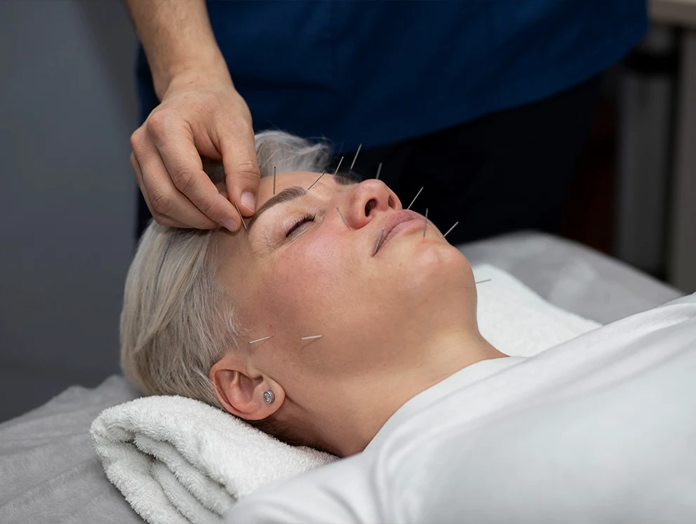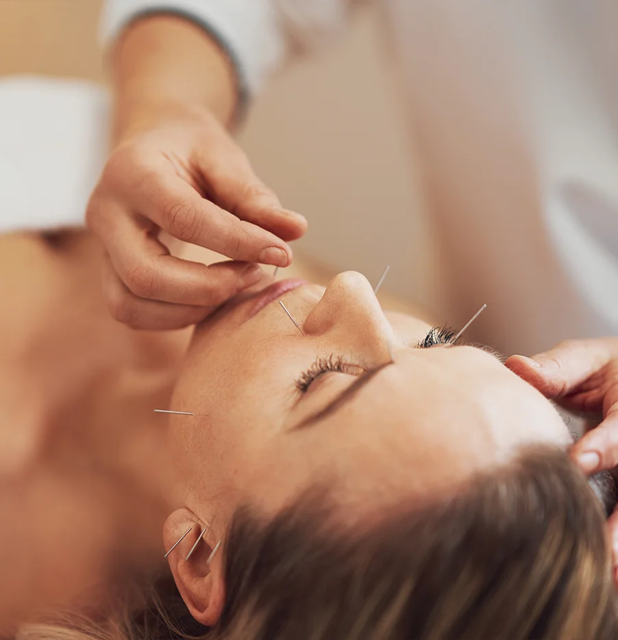 Bevor wir uns dem Gesicht widmen, setzen wir gezielt Nadeln an sogenannten „Distal-Punkten“ (z.B. an Händen, Unterschenkeln oder Füßen).